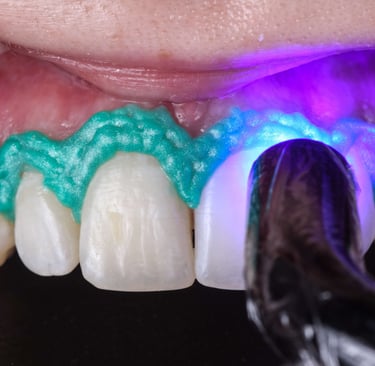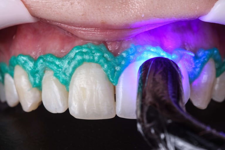 1- Moldagem Personalizada: O dentista tira um molde dos seus dentes para confeccionar moldeiras de silicone flexíveis e totalmente personalizadas, que se encaixam perfeitamente na sua boca.